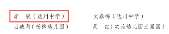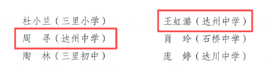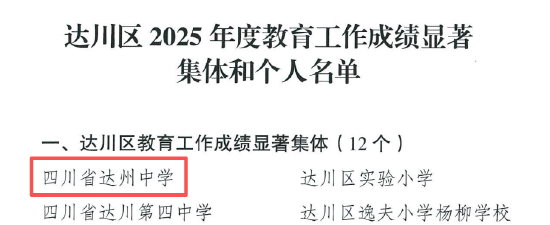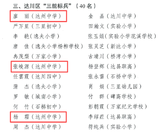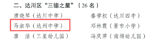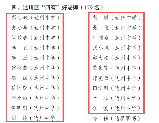 达州中学荣获达川区教育工作成绩显著集体;马淑华、李锐荣获达川区“三德之星”;廖丽、张峻源、杨霜、周寻、王虹潞荣获达川区“三能标兵”;彭忠政、先小华、闫敦春、李莉、李拯、雷智慧、漆丽、岳国庆、周小丽、黄明明、刘玲、杨鹏、张佳、邹国焱、汤小凤、赵大松、黄家芹、郑凌云、田空明、肖杨、余波荣获达川区“四有”好老师;杨刚、刘召梅、陈维权荣获达川区教育工作突出个人。