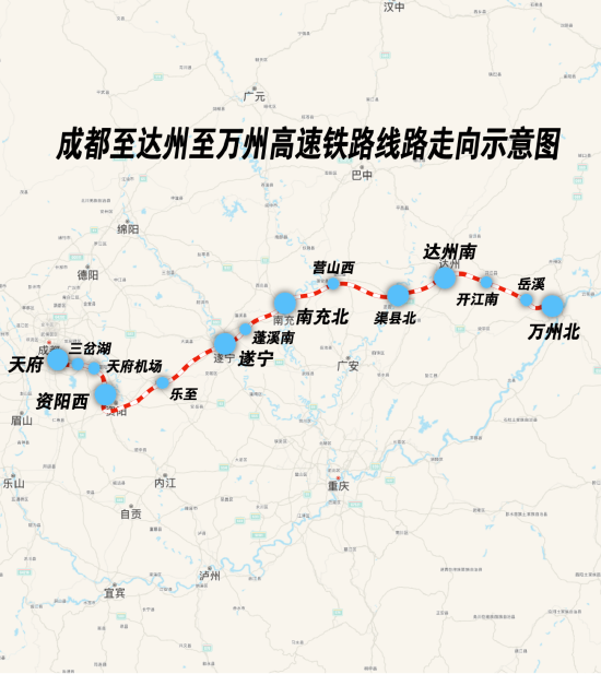 成达万高铁是我国“八纵八横”高铁网沿江通道的重要组成部分,线路起于四川省成都市天府站,途经四川省资阳市、遂宁市、南充市、达州市及重庆市开州区、万州区,最终接入既有郑渝高铁万州北站。全线共新建乐至站、蓬溪南站、营山西站、渠县北站、达州南站、开江南站、岳溪站7座车站。